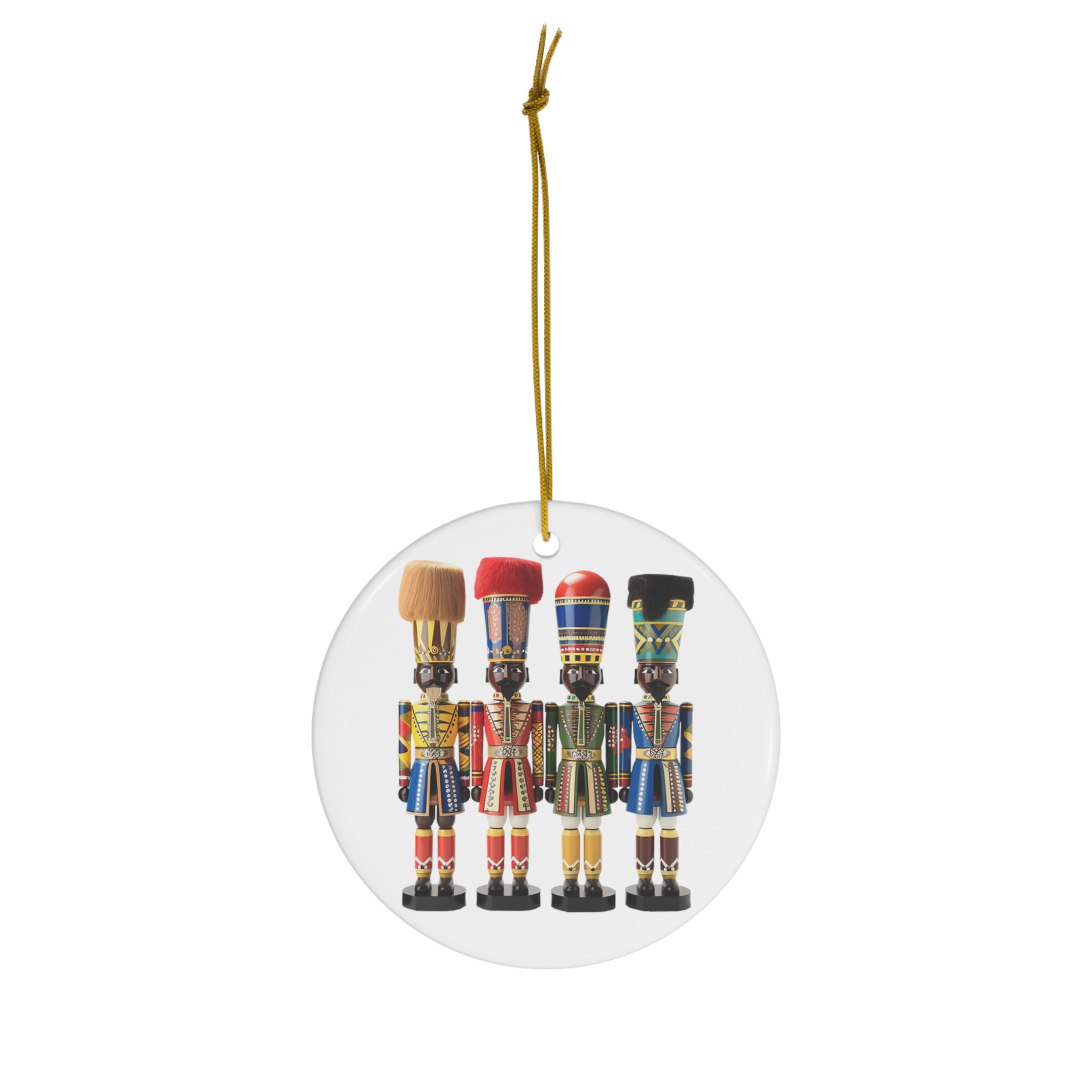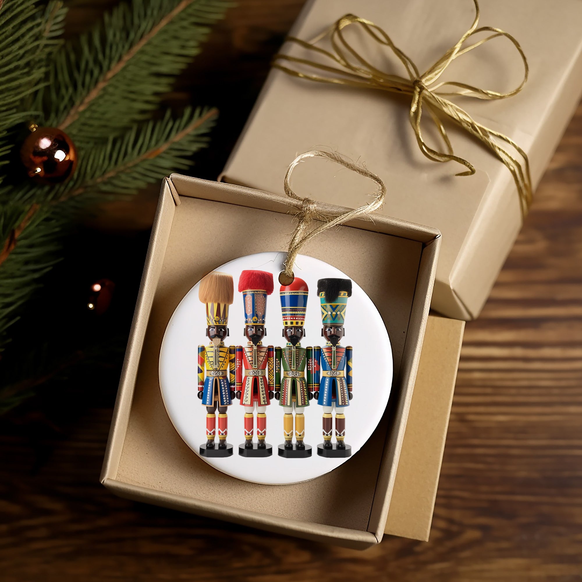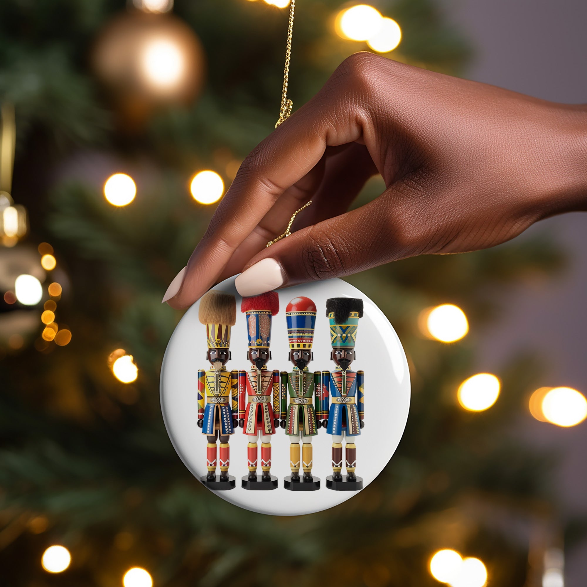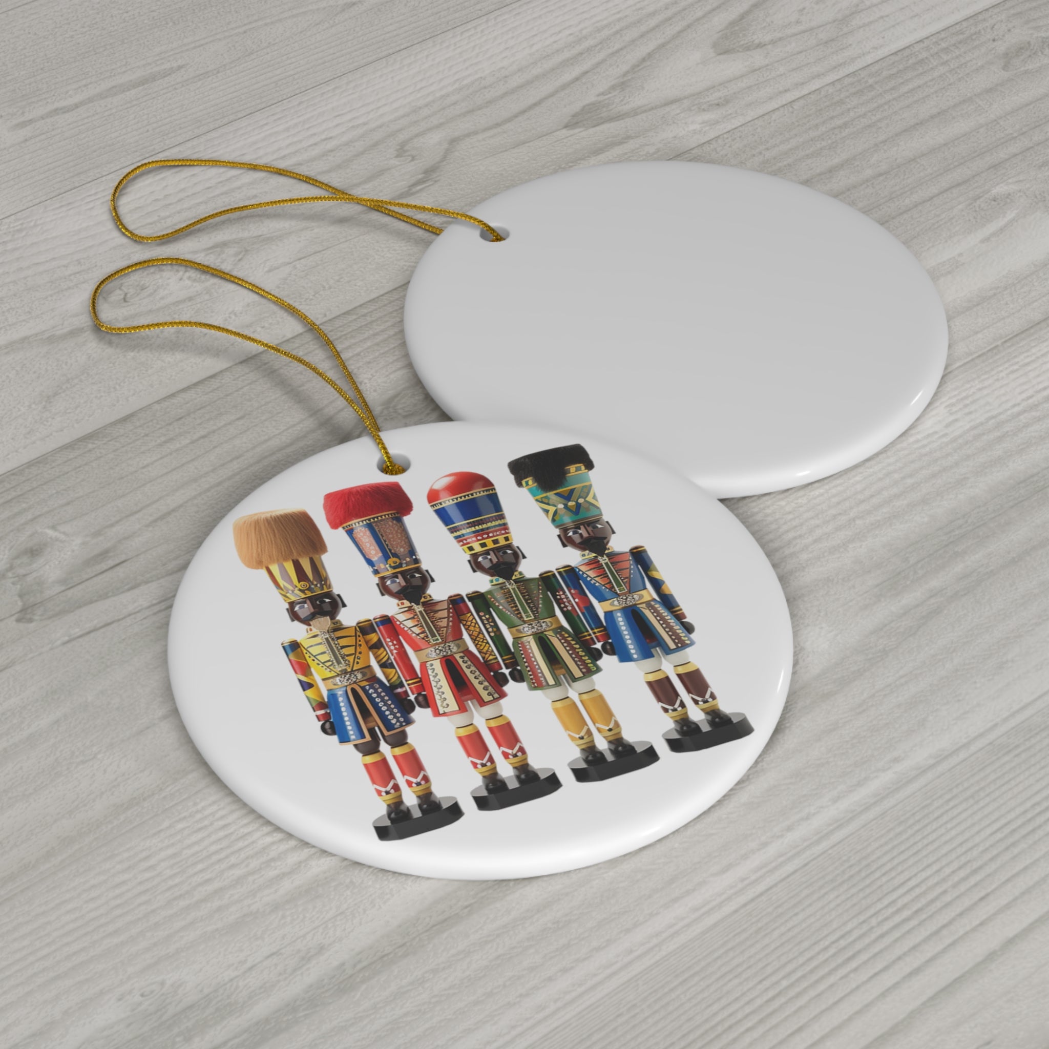 This round white ceramic Christmas tree ornament features Black Nutcracker Soldiers dressed in colorful parade uniforms. Perfect festive ornament for your tree or for gifting!