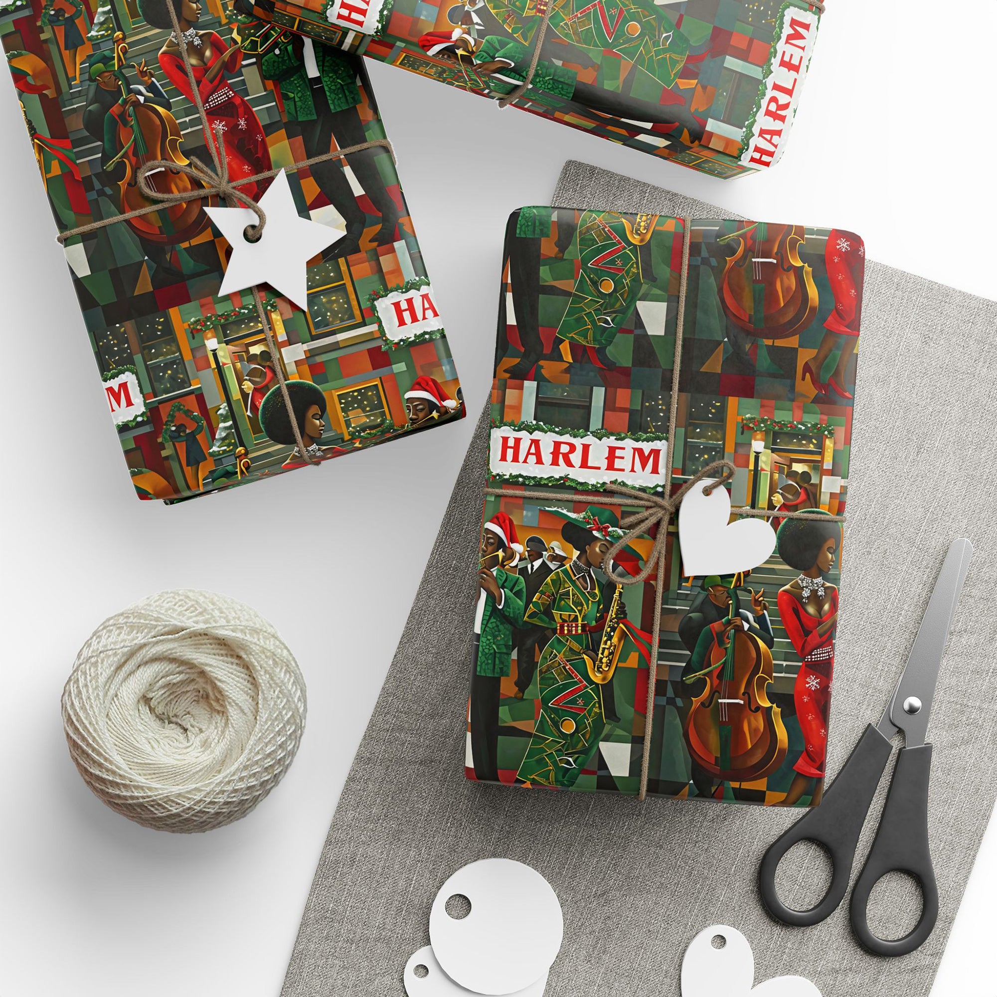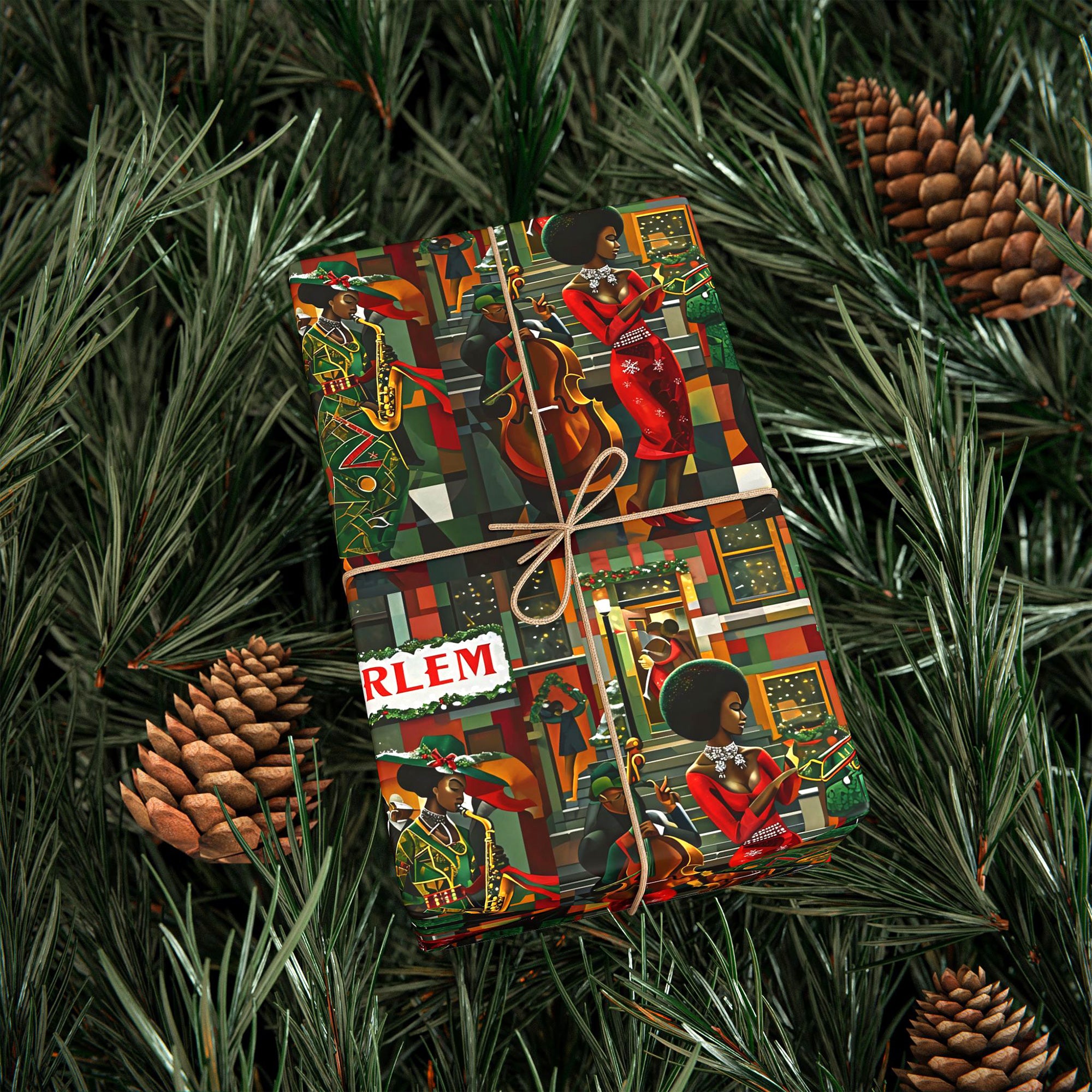 Afrocentric Christmas wrapping paper featuring Harlem jazz musicians in a retro Harlem Renaissance style, perfect for African American holiday gifts and cultural Christmas décor.