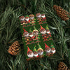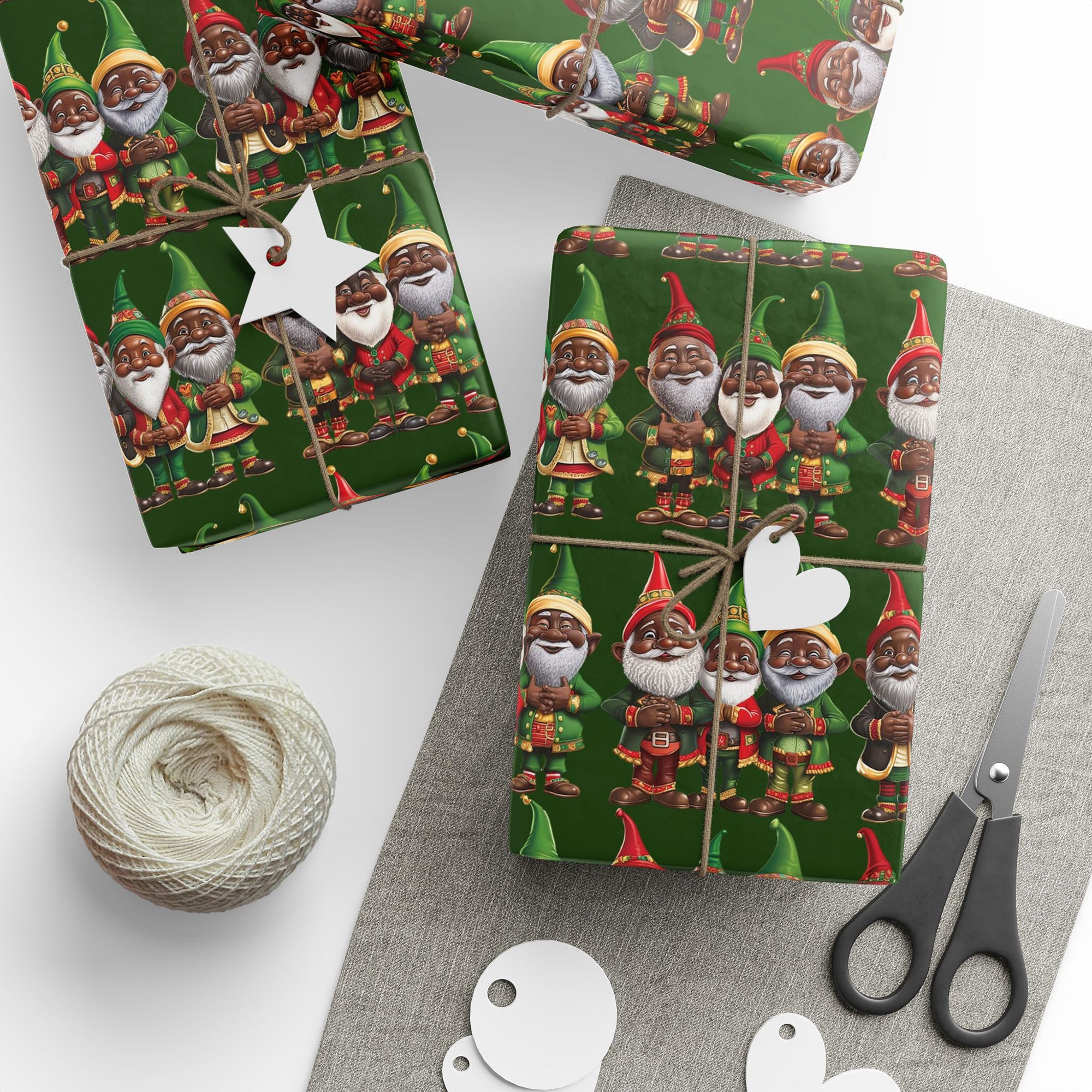 Black Santa Elves Christmas Wrapping Paper featuring African American gnomes and festive Afrocentric designs in red, green, and gold, perfect for holiday gifts and Christmas décor.