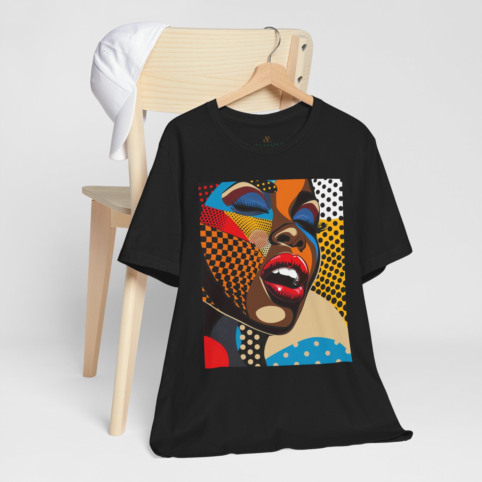 Beautiful Black Girl Pop Art Tee featuring a comic book-style illustration of an African American woman with closed eyes and bold red lips singing. Designed in bright, vivid colors with Afrocentric flair and Pop Art movement aesthetics.