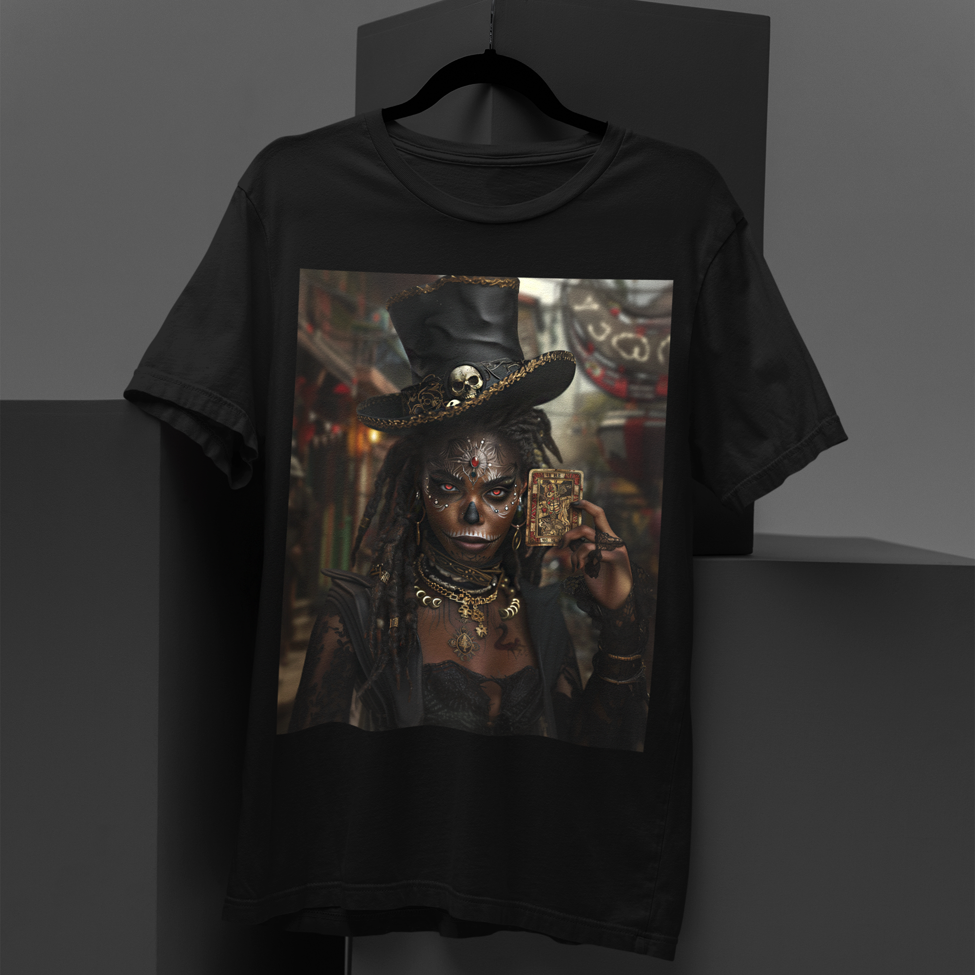 Command attention with this bold Voodoo Priest Tee Shirt, featuring a striking Afrocentric gothic illustration. The design showcases a voodoo priest in a tall top-hat, skull face paint, piercing red eyes, making it a powerful piece of wearable art that blends mysticism, culture, and dark fantasy.