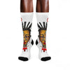 Abstract Afrocentric crew socks featuring a continuous calf wrap print of a Black man with a split human and robot face in an Afrofuturism art style, with black heel and toe panels. Series 02