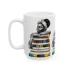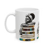 White coffee mug featuring an Afrocentric illustration of a peaceful Black woman embracing books, symbolizing education, knowledge, freedom, and generational legacy.